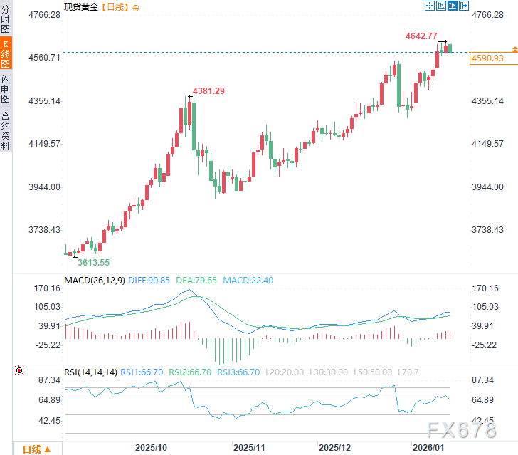 周四(1月15日)亚市时段,现货黄金震荡下行,日内跌幅约0.65%,因报告显示伊朗与镇压相关的杀戮事件正在减少,且未计划进行大规模处决,撤销了部分地缘风险,但不改长期看涨倾向。前一交易日一度触及每盎司4642.77美元的历史新高,现仍交投于4595美元附近,处于历史高点不远处。